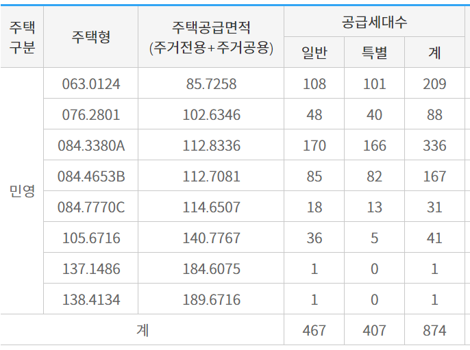 전용면적은 63㎡, 76㎡, 84㎡, 105㎡, 137㎡,138㎡로 소형부터 대형까지 다양하게 공급될 예정입니다