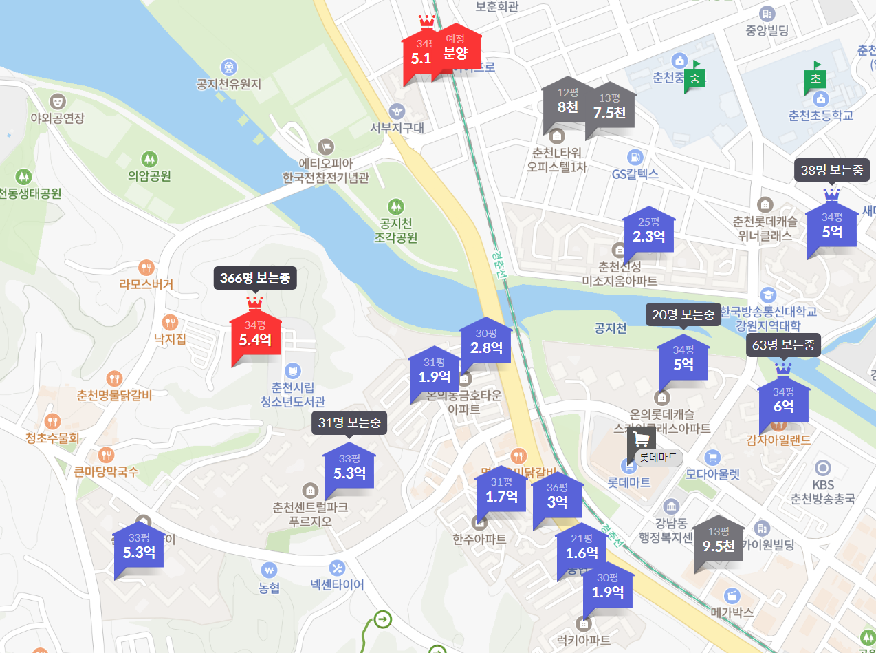 또, 마트나 생활인프라가 좀 더 밀집된 있는 쪽의 아파트인 온의롯데캐슬스카이클래스아파트는 5억, 춘천센트럴타워푸르지오는 6억대에 형성되어 있는 것으로 확인됩니다.