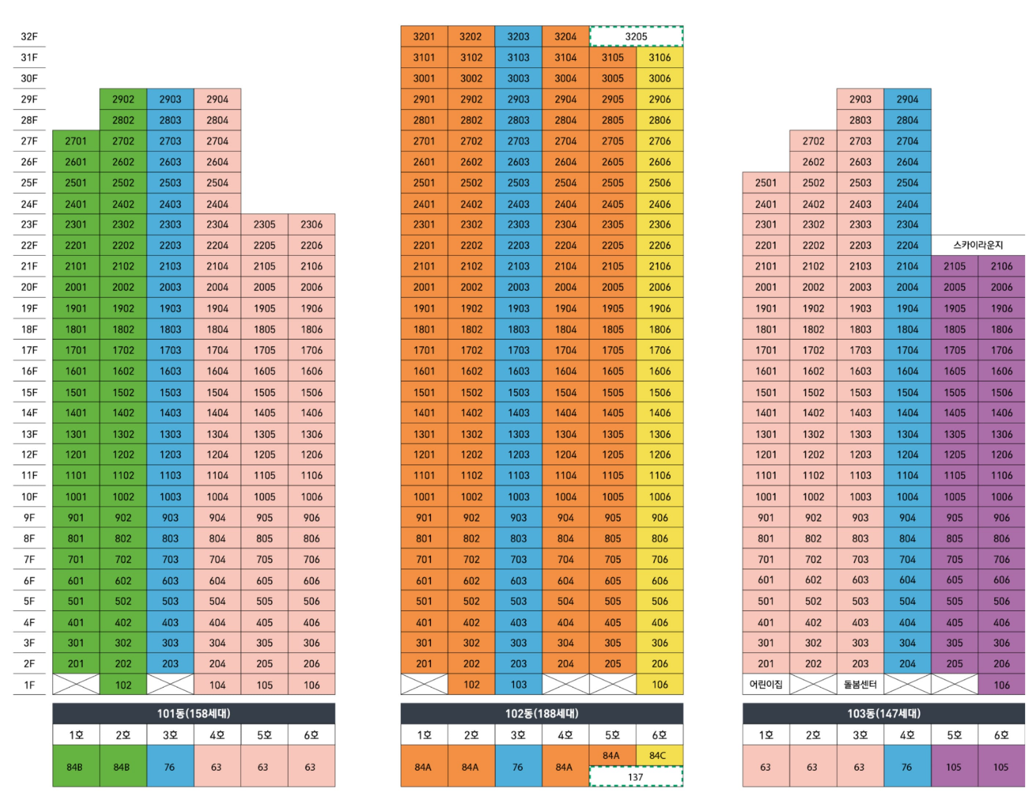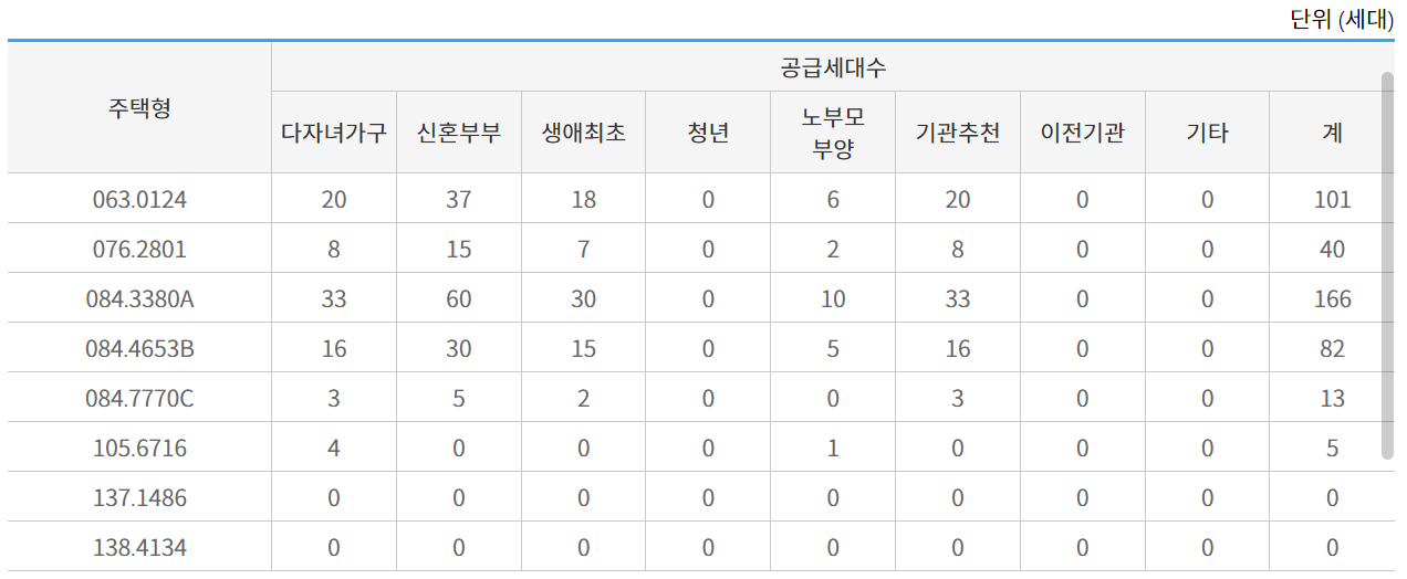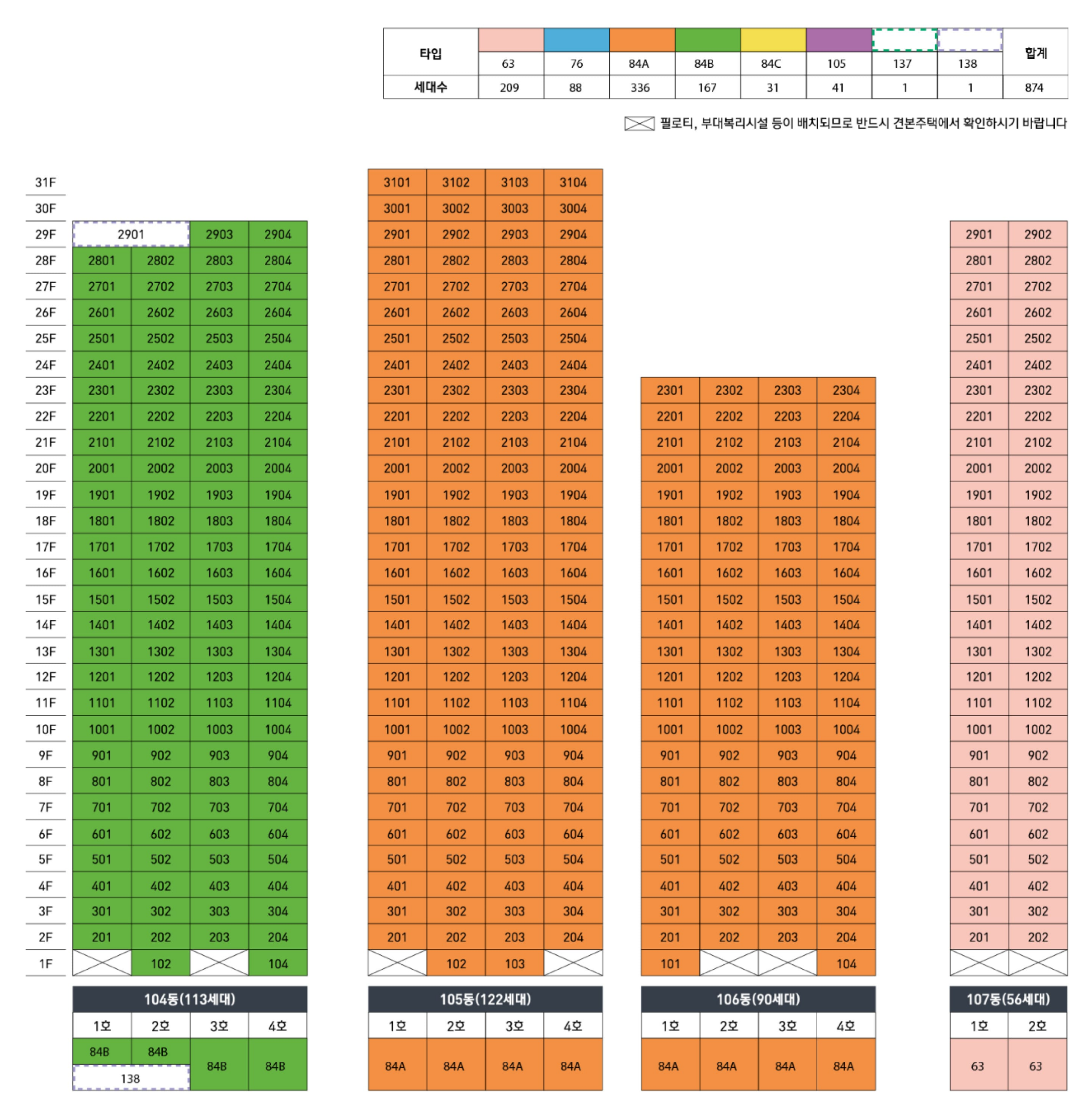 공급대상은 63 타입(26평) 209세대, 76 타입( 31평) 88세대, 84 타입(34평) 534세대, 105 타입(42평) 41세대, 137~138 타입(56평) 2세대 공급하며, 특히 대형평형 2세대는 로열동 탑층에 위치해 얼마나 전망이 좋을지 기대가 됩니다.