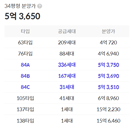 | 타입 | 공급세대 | 분양가 | 발코니확장 | 분양가+확장비 |